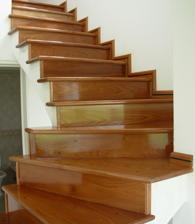Escalera maciza en madera de angelín. Escalones de una sola pieza de 1 m de largo y 29 cm de ancho con un espesor de 35 mm. Los encastres del descanso se confeccionan sobre la misma tabla confiriéndole mayor resistencia. De esta manera usted impide que el descanso se revire y deje juntas desagradables entre tablas. Los frentines son confeccionados en 20 mm de espesor en la misma especie de madera. Fabricación propia, pulido y plastificado alto transito, material importado de Alemania.